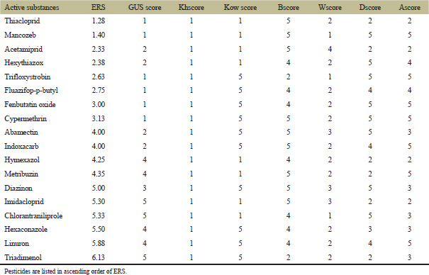 Table 3 shows 18 AIs, which are mostly used in Ain Naga and Doucen districts, and their scores of parameters useful to calculate pesticide (ERS score) (GUS score, Kh score, Kow score, B score, W Score, D score, and A score). Soil microbial toxicity value was excluded when calculating the ERS scores due to the lack of references; thus, only the available values related to the toxicity of algae (A), bee (B), daphnia (D), and worm (W) were considered [9,34].