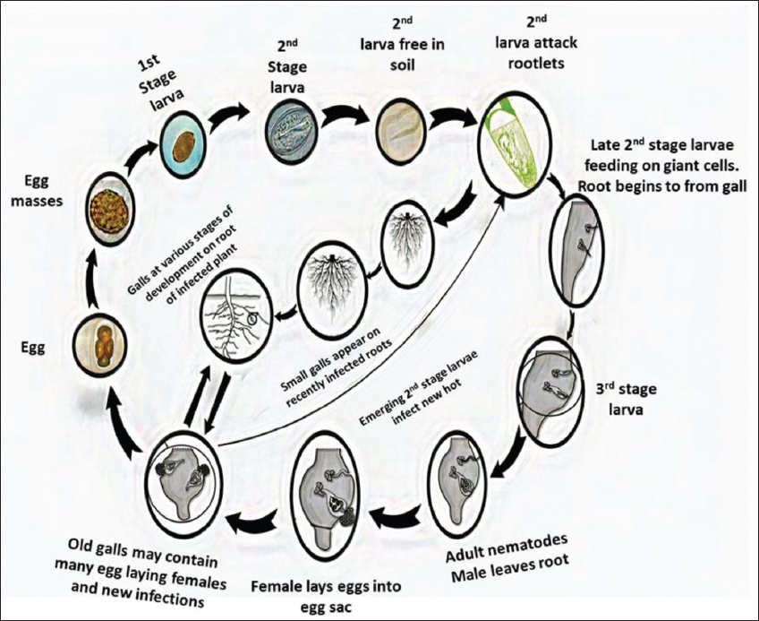 The lifecycle of all Meloidogyne spp. constitutes six stages [Figure 2] occurring within a duration of about 3–6 weeks. First stage is known as the egg stage, where the nematodes deposit over 1000 eggs in the form of a sticky mass which manages to survive on the soil surface as well as plant residues. In these masses, eggs are clustered to prevent loss of viability due to dehydration. After deposition, the eggs start to multiply to form a first juvenile stage. In the first juvenile stage (J1), coil-like structures appear inside the egg membrane and are characterized by the presence of a stylet. Hence, obtained first juvenile stage gives rise to an infective second-stage juvenile (J2) which hatches within 48 h. Among various nematodes, the Meloidogyne spp. juveniles are only such nematodes that inject esophagus gland secreted substances to apical meristem cells in an attempt to create feeding sites known as giant cells, which act as a channel to pass nutrients from the plant to nematode. Soon after, the second-stage juvenile (J2) becomes adult. In the adult stage, the male nematodes disappear from the roots, while the females swell on maturity producing several numbers of eggs, with or without the involvement of males. Interestingly, the male: female ratio in the nematode population, during this event of reproduction, is balanced generally. This can be attributed to the unique character of immature females to undergo metamorphosis into males, in an instance where the population density does not equate [17].
