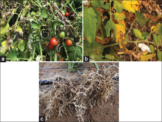| Figure 3: The effect of root-knot nematodes causes (a) wilt, (b) yellowish of leaves and (c) gall formation in Solanacearum lycopersicum species (Source: Atamian et al., 2012) [Click here to view] |