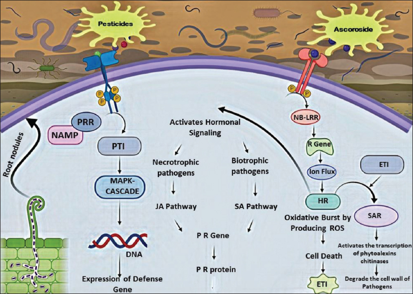 Plants employ a defense mechanism to elude from pathogenic nematodes. Such plants generally consist of different proteinase inhibitors, which provide a suitable defense mechanism against those pathogens. These proteinase inhibitors act on nematode proteases, causing starvation due to nutrition depletion. The nematode surfaces consist of various small signaling molecules, such as the Microbe-Associated Molecular Patterns/Nematode-Associated Molecular Patterns (NAMP), which have a root surface pattern recognition receptor (PRR) [41]. On binding to the PRR, triggering of the pattern or NAMP triggered immunity (PTI) occurs [Figure 4] and thereby initiates the Mitogen-activated protein kinase cascade to eventually activate the plant genes responsible for defense. Countering this, the nematodes secrete an effectors molecule, as caroside, along with the effector molecules to hijack the plant cellular system [42]. About time, sensor proteins such as the nucleotide binding leucine-rich repeat proteins are also put into action, while the pathogen detection would have stimulated the R-gene activation to produce the resistance protein. Soon after activation, the resistance protein causes an ion-flux, involving potassium and hydrogen ions to initiate a hypersensitive response (HR) [43]. This HR causes oxidative burst by producing reactive oxygen species mediated cell death to trigger the deposition of lignin and cellulose around the surrounding cells in an attempt to contain the pathogen infection. Such an event is considered to be a short-term response to infection by the plant. The HR also triggers other types of effectors-triggered immunity inducing systemic acquired resistance enhancing the immunity in plants [44]. In an event of failure of HR, activation of hormonal signaling pathway begins, which is a parasite species specific response. While the necrotrophic parasites induce the jasmonic acid pathway [45], the biotrophic parasites will initially induce the salicylic pathway, which further prompts different hormonal pathways and to activate pathogen-related defense gene(s) of the plant [46]. Following this, PR protein expression is upregulated to act against the nematode infection, in combination with various other protein factors.