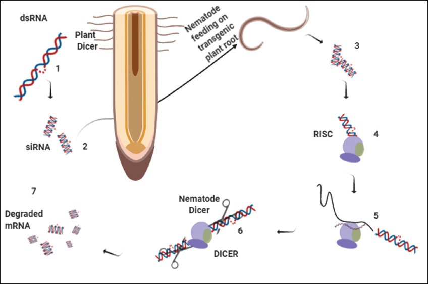 | Figure 5: Mechanism of RNA interference (RNAi), double-stranded RNA (dsRNA) is processed by plant dicer enzyme (1) into (2) once this dsRNA was uptake by these nematodes during feeding (3) once they uptake dsRNA, the nematodes execute dsRNA to shorter interference RNA (4) and also unwind the sense and antisense strands. The RISC complex is filled with antisense strand interacts with the corresponding mRNA in nematodes (5), this makes mRNA to cleave by RISC (6) and leads to degradation of mRNA (7) (Source: Agrawal et al., 2003)[53] [Click here to view] |