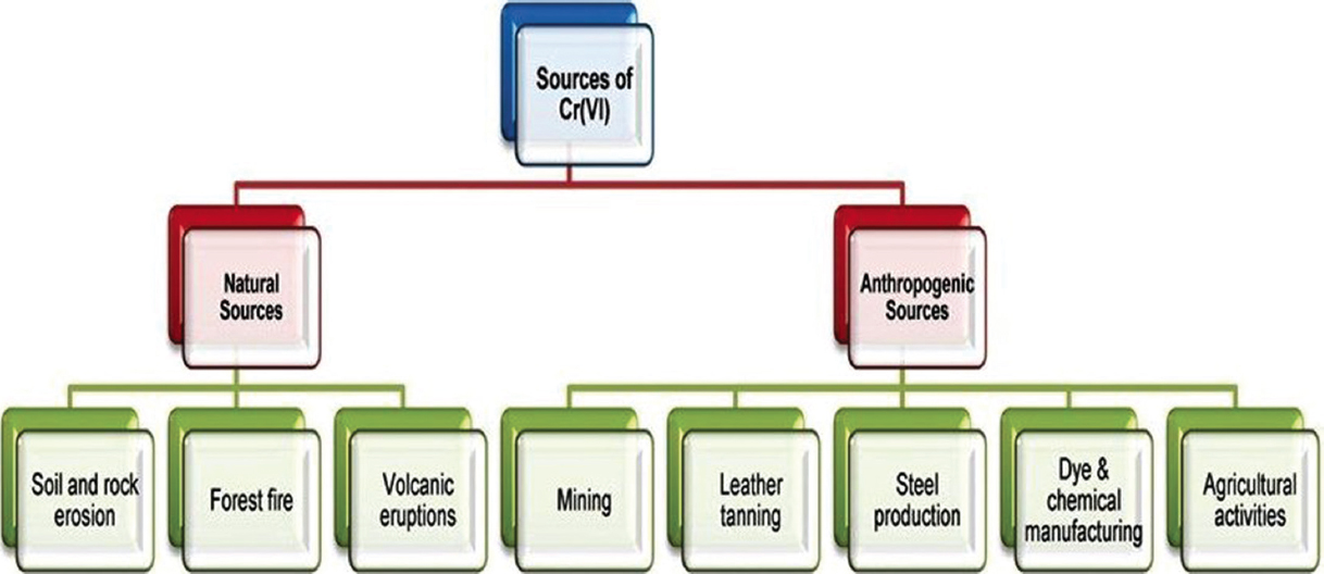 The silver-gray colored chromium is a lustrous and abundant heavy metal. Its reactivity is high as compared to the other transition metals such as cadmium, lead, mercury, nickel, and copper. The enrichment of chromium in our environmental components is possibly linked with its wider application in multiple types of industrial activities [1]. From all the oxidation states of Cr, the less reactive trivalent chromium, Cr(III) and highly reactive hexavalent chromium, Cr(VI) are comparatively stable. The Cr(VI) is treated as hazardous for the living biota. The Cr(VI) rich industrial effluents not only contaminating the surface water of water bodies but also pollutes the groundwater and soil to some extent due to leaching and percolations.