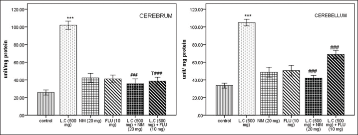 In Figure 4, it demonstrated that the level of MDA in the cerebrum and cerebellum of the L. camara (500 mg/kg) induced mice was significantly elevated (P < 0.001) than that of the control group. This raise of LPO indicates an increase oxidative stress in the brain of L. camara treated mice. Interestingly, calcium antagonists NIM and FLU could attenuate the elevation.