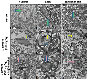 The examination of TEM images of the brain tissue further confirmed that L. camara caused abnormal ultrastructural changes in the cerebrum including neuroapoptosis; mitochondrial changes such as loss of cristae, swollen, and elongated mitochondria as well as nuclear alterations; coarse and clumpy chromatin, non-myelination of axons. These changes were similar to the findings of [45,46].