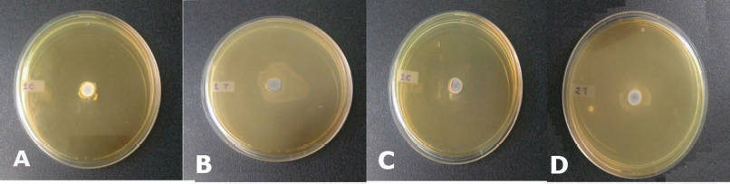 ![]() | Figure 1: The BSH activity of test isolates grown on bile salt – MRS medium while exhibited by the developement of precipitation zone nearby the colony. (A) Control (without bile salt), (B) L. plantarum MBTU-HK1 with BSH activity, (C) Control (without bile salt) and (D) L. plantarum MBTU-HT with BSH activity on bile salt -MRS agar plate. [Click here to view] |