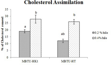 ![]() | Figure 5: CE inhibitory activity of L. plantarum MBTU-HK1and MBTUHT. The data are presented as mean ± SE. Data with distinct superscripts are significantly precise, where p < 0.05. [Click here to view] |