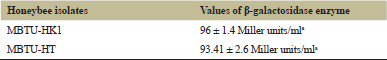 ![]() | Table 1: Quantitative determination of the β-galactosidase activity of L. plantarum MBTU-HK1 and MBT-HT expressed in Miller Unit. The data are presented as mean ± SE. where p < 0.05. [Click here to view] |