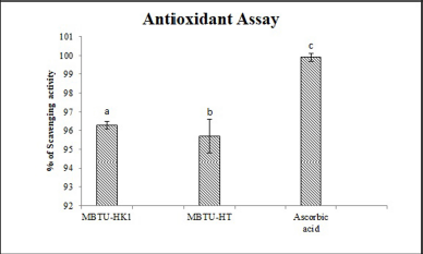 ![]() | Figure 4: Antioxidant activity of L. plantarum MBTU-HK1 and MBTU-HT. The data are presented as mean ± SE. Data with distinct superscripts are significantly precise, where p < 0.05. [Click here to view] |