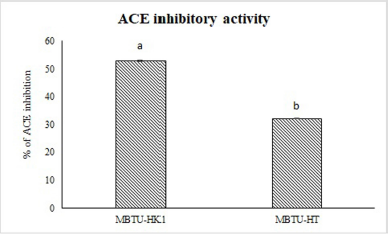 The evaluation of ACE inhibitory activity determined antihypertensive peptides of milk proteins. Test strains possesses ACE inhibitory activity in varying levels. Lactobacillus plantarum MBTU-HK1 showed 52.9% ± 0.28% and L. plantarum MBTU-HT recorded 32.2% ± 0.06% of ACE inhibitory activity (Fig. 5).
