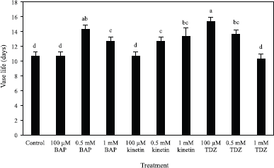 The cut flower kept in Milli Q water (control) had a vase life of 11 days only; however, treatment with cytokinin increased the vase life of cut Gladiolus flowers evidently. The vase life of flowers kept in 0.5 mM BAP, 1 mM kinetin, and 100 µM TDZ solutions increased to14, 13, and 15 days, respectively, indicating that TDZ was the most efficient cytokinin in enhancing the vase life of Gladiolus (Fig. 2).