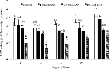 The LOX activity decreased gradually till stage II and then activity increased till stage V in both control and cytokinin treated flowers (Fig. 8). At any given stage, the LOX activity was remarkably less in cytokinin-treated flowers as compared to controlled one. LOX activity significantly decreased by 44.20%, 36.10%, and 12.15% in the flowers treated with 100 µM TDZ, 0.5 mM BAP, and 1 mM kinetin as compared to control. Minimum LOX activity was seen in the flowers subjected to 100 µM TDZ treatment.