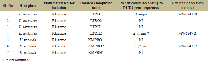 ![]() | Table 1: Endophytic fungi isolated from rhizomes of L. toxicaria and K. rotunda. [Click here to view] |