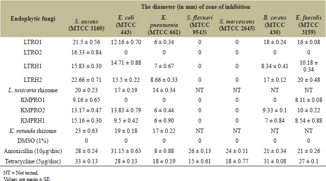![]() | Table 2: Antibacterial activity of crude plant rhizome extract and isolated endophyte extracts (0.5 mg/disk) against different bacteria. [Click here to view] |