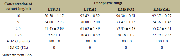 The anthelmintic potentials of fungal extracts were studied using 1st instar larvae of Haemonchus contortus by in vitro larvicidal assay. First stage H. contortus larvae were obtained by incubating eggs (obtained from infected animals) at 27°C for 24 hours. Approximately 100 motile larvae of first instar (L1) were collected in 100 μl water. To this equal volume of serially diluted fungal extracts were added to get a final concentration of 1.25, 2.5, 5, and 10 mg/ml. Albendazole (ABZ) (1 µg/ml) and DMSO (1%) served as positive and vehicle controls, respectively [26]. All samples were then incubated for 24 hours at room temperature. The loss of motility of the larvae after 24 hours of treatment was recorded. A number of larvae found non-motile/dead were counted under a dissecting microscope at 40× magnification [27] to calculate the mortality percentage.