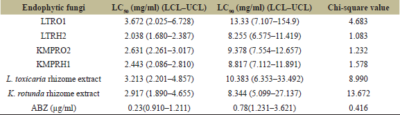 ![]() | Table 5: LC50 and LC90 values for H. contortus larval mortality by endophytes using probit analysis. [Click here to view] |