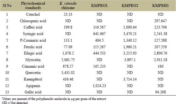 ![]() | Table 7: Estimation of different polyphenols in ethyl acetate extracts of K. rotunda rhizome and its endophytes. [Click here to view] |