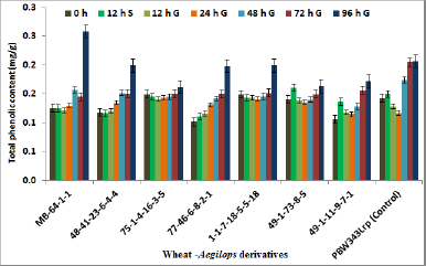 ![]() | Figure 3: Effect of soaking and germination on total phenolic content of biofortified wheat-Aegilops derivatives. [Click here to view] |