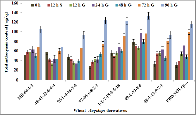 The changes of the TAC (mg/kg) during germination are shown in Figure 4. In ungerminated wheat flour, TAC was noticed in the range of 31.2–78.6 mg/kg, with maximum content in sample 49-1-73-8-5 (78.6 mg/kg) followed by 48-41-23-6-4-4 (58.9 mg/kg), 1-1-7-18-5-5-18 (56.1 mg/kg), MB-64-1-1 (51.7 mg/kg), 75-1-4-16-3-5 (47.7 mg/kg) and least content was found in 77-46-6-8-2-1 (29.2mg/kg) as compared to control genotype PBW343 LrP (31.2 mg/kg). Analysis of 12 hours soaking samples revealed that TAC reported a mixed response with few samples reported increased content in the range 11.9%–70%, whereas, there was a decrease from −7.8 to −28.7% in some wheat derivatives. Similar trends in responses were obtained at 12–48 hours germination stages. However, at 72 hours and 96 hours germination stages, TAC was increased from 156.9% to 216.9% and 189.3% to 324.7% over ungerminated sample, respectively. The highest increase in content of total anthocyanin was observed in derivatives 77-46-6-8-2-1 (324.7%) followed by PBW343 + GPC + Lr24 (271.1%) and 49-1-11-9-7-1 (183.9%), respectively.