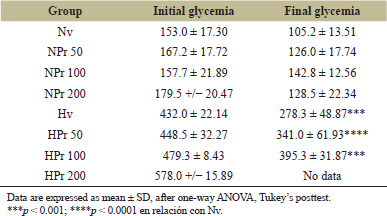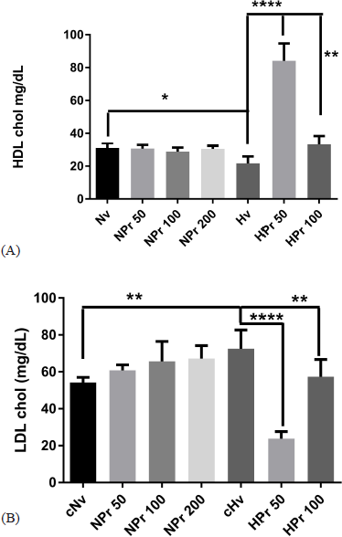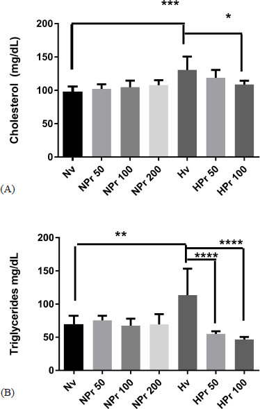 Regarding HDL-c, the group of hyperglycemic animals treated with the vehicle, Hv (31.00 mg/dl ± 2.68), presented a difference in the Nv group (30.3 mg/dl ± 2.4). Interestingly, in the HPr 50 and HPr 100 groups, a significant elevation was observed (84.1 mg/dl ± 10.7 and 32.9 mg/dl ± 5.4, resp.), so it is presumed with these doses a cardioprotective effect (Fig. 2A).