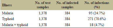 The study included a total of 1,378 samples, out of which 384 samples were positive. Out of 384 positive cases, malaria positive were found in 95 (24.7%) patients, typhoid fever positive were in 271 (70.6%) cases, and in 18 (4.7%) patients coinfections were found (Table 1).