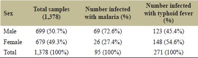 ![]() | Table 2. Prevalence of both malaria parasite and typhoid fever infections according to sex. [Click here to view] |