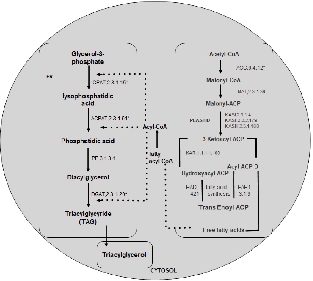 ![]() | Figure 1. Schematic representation of TAG synthesis in diatoms. ER =, endoplasmic reticulum; G3PDH =, glycerol-3-phosphate dehydrogenase; ACC =, acetyl-coA carboxylase; GPAT =, glycerol-3-phosphate acyltransferase; MAT =, malonyl-coA-AcP transferase; AgPAT =, 1-acylglycerol-3-phosphate acyltransferate; KAS =, 3-KETOACYL-AcP synthase; PP =, phosphate acyltransferase; KAr =, 3-Keyoacyl-AcP reductase; DgAT =; diacylglycerol acyltransferase; hAD =, 3-hydroxyacyl-AcP; Ear =, enoyl-AcP reductase (modified from [32]). [Click here to view] |