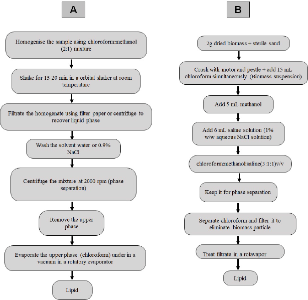 ![]() | Figure 2. Diagrammatic representation of two different methods for lipid extraction. (A) Filch method and (B) Bligh and Dyer method (modified from [29,31]). [Click here to view] |
