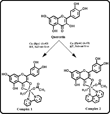 An accurately weighed amount of compounds was taken followed by grinding and employing a clean and dried mortar pestle at room temperature. The stoichiometry of all the ingredients for synthesized compounds, i.e., complex 1 and complex 2, was 1:1:1. Complex 1 (brown) was synthesized with Q (1 mmol), 2, 2?-bipyridal (1 mmol), and Cu (II) metal ions (1 mmol) by the solid-state trituration method. Q (1 mmol), 1, 10-phenanthroline (1 mmol), and Cu (II) metal ions (1 mmol) in the solid state were used for complex 2 (dark brown) syntheses by the same methodology. The change in color after trituration of the ingredient indicates the formation of a product which is further characterized by using different spectroscopic techniques.