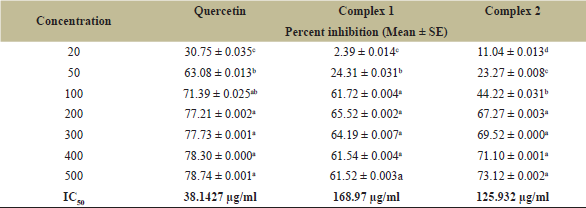 It is seen that Q (IC50 = 38.1427 μg/ml), complex 1 (IC50 = 168.97 μg/ml), and complex 2 (IC50 = 125.932 μg/ml) have significant free radical scavenging activities at concentrations of 20, 50, 100–500 μg/ml, respectively. From that, it was concluded that complex 2 has significant antioxidant activity when compared to complex 1 and Q (Fig. 4, Table 2).