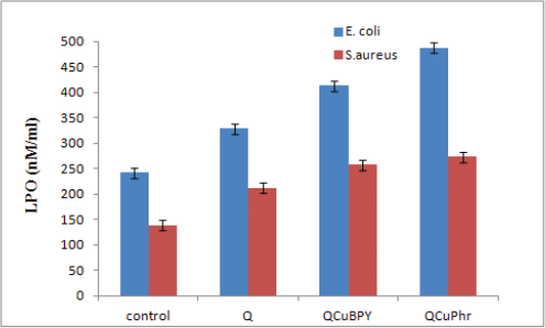 LPO or malondialdehyde (MDA) examination assumes a significant role in oxidative stress by losing peroxy radicals and singlet oxygen. It loses chemical malondialdehyde that is responsible for oxidative stress in the treated bacterial culture. Therefore, the activity of complex 1 and complex 2 treatments on the MDA level of E. coli and S. aureus was measured. Complex 2 (487.37 nm/ml)-treated E. coli showed highest level of MDA when compared to complex 1 (413.46 nm/ml), Q (328.38 nm/ml), and normal control (241.68 nm/ml). A similar trend was observed in S. aureus-treated cells also in the order of complex 2 (273.36 nm/ml), complex 1 (258.17 nm/ml), Q (211.67 nm/ml), and normal control (138.32 nm/ml) (Fig. 6). These outcomes propose that the inhibition of bacterial growth was because of complex 1 and complex 2-mediated upregulation of malondialdehyde level in the bacterial cells. Past examinations firmly recommend that oxidative pressure assumes an urgent job in mediating toxicity in bacterial cells and our outcomes demonstrate that copper derivatives produced higher levels of reactive oxygen species generation compared to control [34].