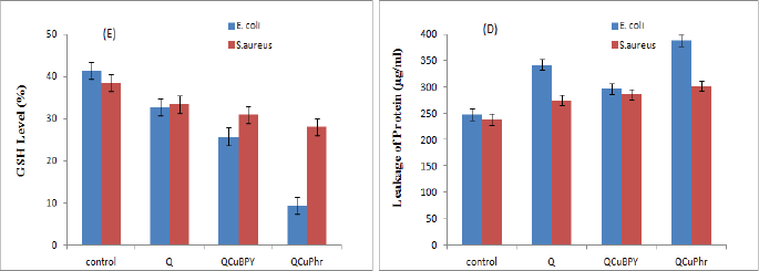 ![]() | Figure 7. Effect of complex 1 and complex 2 on leakage of protein and GSH activity (D) for protein leakage analysis. E. coli and S. aureus cells were treated with the respective MIC of complex 1 and complex 2 for 12 hours, and protein levels were measured using the Lowry method; and (E) for GSH analysis, (A) E. coli and S. aureus cells treated with respective MIC of complex 1 and complex 2 for 12 hours. GSH levels were estimated enzymatically in the free supernatant dependent on the decrease of 5,50-dithiobis-(2-nitrobenzoic acid) by the GSH reductase system. [Click here to view] |