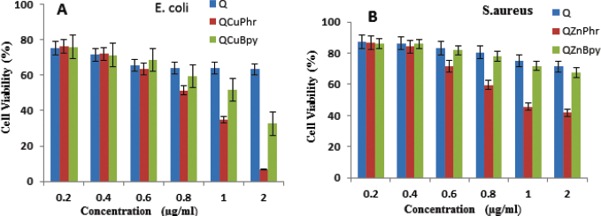 The minimum inhibitory concentration activity of the ligand and its complexes concentrated on the development of tried types of microorganisms. It was seen that Cu (II) complexes have a higher growth inhibitory impact than free ligands. With regard to E. coli, Cu (II) complex 2 (6.35 μg/ml) was observed showing the most potent activity when compared to the complex 1 (25.83 μg/ml) and Q (31.25 μg/ml). The same trend was observed in the case of S. aureus also with slightly higher MIC values in comparison to E. coli in the order of complex 2 (13.74 μg/ml), complex 1 (50.37 μg/ml), and Q (62.57 μg/ml). Finally, it was observed that the MIC value of complex 2 is most significant in both E. coli and S. aureus when compared to the free ligand and complex 1 (Table 3). Prior examinations have also reported copper derivatives as an effective antibacterial agent in different Gram-negative and Gram-positive microbes and the growth inhibition was in a dose-dependent manner [32].