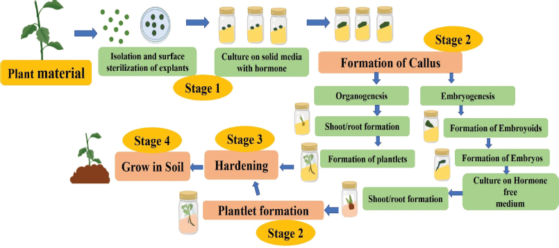 The process of micropropagation is completed in three major stages: initiation phase, multiplication phase, and root formation (Fig. 1). The initiation phase is the first phase of tissue culture which is achieved by the introduction of tissue of interest in culture, followed by its sterilization to make it free from any microbial contamination. The second stage of tissue culture is the multiplication stage, which is achieved by redividing and introducing the in vitro plant material into the medium supplemented with growth regulators and nutrients. This stage is repeated several times to obtain the number of desired plants and characterized by tissue propagation and numerous roots production. The third stage also called the root formation stage is characterized by the formation of roots and dependent on essential hormones to achieve proper rooting and come plantlets [30].