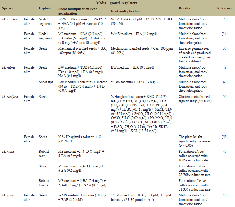 The work on tissue culture on M. nana was carried out by only Lin-lin [45]. The author used different explants like roots, stem, and leaves derived from sterile seedlings of M. nana for the generation of callus. For this purpose, they used MS medium with different concentrations of growth regulators 6-BA, NAA, 2,4-D, and PVP was added at the time of rooting induction. Their results showed 100% of optimal root callus induction in culture medium supplemented with MS, 2,4-D (1 mg/l) and 0.2 mg/l 6-BA, whereas 78.67% optimal stalk callus induction in culture medium with MS, and 2,4-D (1 mg/l), and 6-BA (0.6 mg/l). Likewise, 21.3% of stalk callus induction was observed in culture medium supplemented with MS media containing 2,4-D (3 mg/l), 6-BA (0.2 mg/l) and NAA (0.2mg/l) (Table 1).