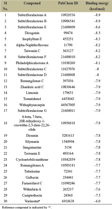 From virtual screening results, it was observed that Subtrifloralactone A, Subtrifloralactone B, Subtrifloralactone E, Diosgenin, Inophyllum E, Alpha-Naphthoflavone, Taiwanin C, Subtrifloralactone F, Philadelphicalactone A, Subtrifloralactone C, Subtrifloralactone D, Remangilones C, Zhankuic acid C, Limonin, Tomatidenol, Withaphysacarpin, Subtrifloralactone G, 4-beta ,7-beta, 20R-trihydroxy-1-oxowitha-2,5-dien-22,26-olide, Diosmin, Silymarin, Sanguinarine, Taiwanin E, Cycloartobiloxanthone, Remangilones A, Tubulosine, Galbacin, Farnesiferol C, Withaferin A, and Camptothecin showed better binding energy (greater than –6.0 kcal/mol of the reference compound), thus signifying that these compounds can be potential HDAC6 inhibitors as well as potential drug candidates for OSCC.