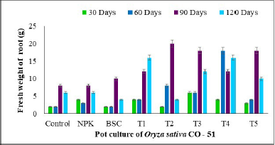 ![]() | Figure 6: Fresh weight of root in rice cultivar CO-51 treated with BSC and Musa spathe extracts—pot culture experiment. [Click here to view] |