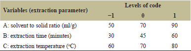 Dried samples (2 g) were used for extraction. The optimization of the extraction process was designed using the Box–Behnken design according to the RSM [17] with six center runs that were used, giving a total of 18 experimental runs. Each factor was surveyed with three levels, coded as –1, 0, and + 1. The dependent variables (responses) analyzed were TPC and TFC of product. The levels of variables are shown in Table 1. The transparent extracts were obtained by filtering (Whatman No. 4 filter paper) and then TPC and TFC of the extracts were analyzed.