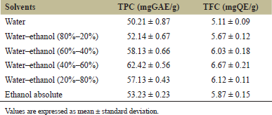 ![]() | Table 2: Extraction TPC and TFC yield of banana peel. [Click here to view] |