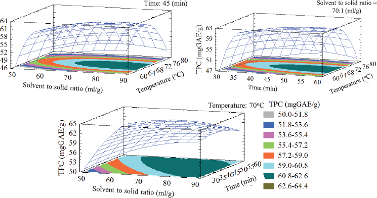 The response surface and main effects plot showed the interaction between TPC of banana peel powder extract and temperature, extraction time, and solvent/solid ratio (Figs. 2 and 3). At the appropriate time, temperature, and solvent/solid ratio parameters, the solvent dissolved the substances in the raw materials, which led to an increase in the total polyphenol content in the extract. TPC increases with an increasing extraction temperature, but when the temperature is too high, the content of biological compounds tends to decrease. When the extraction temperature increases, the solubility and diffusivity of polyphenol compounds and the conversion and wetting of the extracted material increase and the viscosity of the solvents decreases, resulting in the increase in the extraction efficiency of polyphenol compounds [8,25].