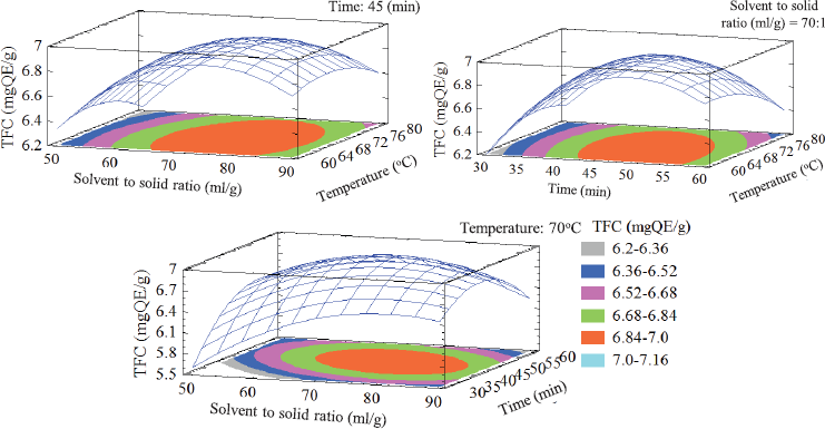 ![]() | Figure 5: Estimated response surface plot for TFC in extract. [Click here to view] |