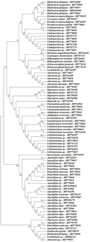 A phylogenetic tree is essential to recognize the relationship between the fungal endophytes associated with C. forskohlii; hence, molecular evolutionary genetics analysis (MEGA X) was used for depicting the same [29].
