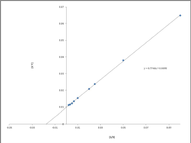 The effect of increasing substrate concentration on the velocity of the enzyme-catalyzed reaction was studied using casein as the substrate at pH 7.5 at 37°C. The effect of increasing substrate concentration on the velocity of the enzyme obeys the Michaelis–Menten equation. The Lineweaver–Burk plot was plotted with 10 μg of protease and the substrate was in the range of 1–500 μM (Fig. 3). The value of Km was 56.56 μM/minute (Fig. 4). Wrighten protease isolated from Wrighten tinctoria showed that Km was 50 μM/minute.