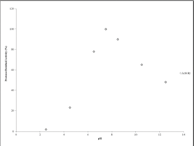 The effect of the pH of the buffer on the purified protease activity was examined to determine the optimum pH of the protease. The proteolytic activity of protease was examined in the pH range from 2.5 to 12.5 to determine the optimum pH. The buffers used were 0.05 M glycine-HCl (pH 2.5), 0.05 M sodium citrate (pH 4.5), 0.05 M sodium phosphate (pH 6.5), 0.05 M sodium phosphate (pH 7.5), 0.05 M Tris-HCl (pH 9.5), 0.05 M Tris-Base (pH 10.5), and 0.05 M glycine-NaOH (pH 12.5). Protease activity was monitored with BAPNA at 410 nm and each assay was carried out in triplicate.