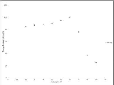 The effect of temperature on the purified protease stability was examined. For studying the heat stability, the protease sample was incubated before the assay at different temperatures ranging from 20°C to 100°C for up to 1 hour. The reaction was initiated by adding a substrate at 37°C. Protease activity was monitored with BAPNA at 410 nm, and each assay was carried out in triplicate.