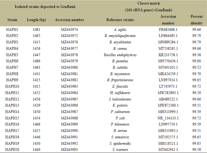 The percent of identity of 16S rRNA gene from black saxaul isolates and the closest relatives from GenBank ranged from 99.38 to 99.79. The isolates represent three phyla: Firmicutes, Actinobacteria, and Proteobacteria. The most numerous is Firmicutes with 13 representatives: HAPH2, HAPH3, HAPH4, HAPH5, HAPH6, HAPH7, HAPH8, HAPH9, HAPH10, HAPH14, HAPH15, HAPH19, and HAPH20. Among 20 isolates, only 4 were related to Actinobacteria (HAPH1, HAPH12, HAPH13, and HAPH17) and 3 to Proteobacteria (HAPH11, HAPH16, and HAPH18). The isolates were divided into three classes: Bacilli (13 isolates), Actinobacteria (4 isolates), and Gammaproteobacteria (3 isolates). There were representatives of five orders: Bacillales (12), Micrococcales (4), Lactobacillales (1), Oceanospirillales (2), and Pseudomonadales (1). All isolates were related to 13 genera: Bacillus (HAPH9, HAPH4, HAPH6, HAPH7, HAPH8, and HAPH2), Arthrobacter (HAPH1), Priestia (HAPH3 and HAPH5), Enterococcus (HAPH10), Halomonas (HAPH11), Isoptericola (HAPH12), Kocuria (HAPH13), Planococcus (HAPH14), Planomicrobium (HAPH15), Pseudomonas (HAPH16), Rothia (HAPH17), Salinicola (HAPH18), and Staphylococcus (HAPH19 and HAPH20).