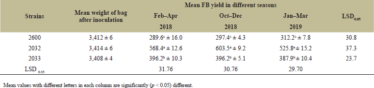 In general, the maximum average total FB yield from each bag was 565.9 ± 12.3 g in strain 2032, and the least was 312.2 ± 7.8 g in strain 2600 (Table 2). The FB yield in each strain during the three seasons of cultivation indicated slight variations that were not significantly different (p >0.05), except in the Oct–Dec 2018 cultivation in strain 2032. The FB yield, which was 603.5 ± 9.2, was significantly different from 568.4 ± 12.6 and 525.8 ± 15.2 obtained during the Feb–Apr 2018 and Jan–March 2019 cultivation seasons, respectively, in strain 2032. However, statistical analyses indicate significant differences (p = 0.02) in total FB yield among the three strains tested during each season (Table 2).