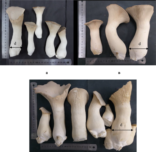 At present, king oyster mushroom production’s total volume is only 0.3%–0.5% of mushrooms grown in Ukraine. At the same time, buyers are ready to pay three times more than the equivalent amount of champignon or the common oyster mushrooms (P. ostreatus). In Portugal, P. eryngii commands high consumer preference and price compared to other cultivated mushrooms [7]. It is the same situation in Ukraine. However, the absence of adapted strains and production technologies using local raw materials can limit exotic mushrooms’ mass production. When cultivated on locally available substrates, the strains that have a high yield and marketable features (consumer appeals) are critical for making a profit in mushroom production. Scientists are actively looking for new and promising P. eryngii strains with better marketable features than the existing commercially available ones [8]. Such improved and locally adapted strains are crucial because commercial mushroom production technologies and location vary greatly; strains and species most adapted to particular locations and production technologies differ. In Italy, seven commercial and five wild P. eryngii strains were evaluated for various characteristics to determine the strains most suitable for commercial cultivation [8]. In general, the size and shape of FBs are criteria farmers consider when choosing the strain to cultivate, which will give the FBs most suitable for postharvest processing (long shelf life and resilience to mechanical damage during packaging). These are critical factors for transporting and distributing the mushrooms over long distances, including export to foreign countries [8]. In a country like Ukraine, where there is the need to expand P. eryngii production, it is critical to have strains most adapted to cultivation on locally available substrates and the prevailing local conditions of commercial exotic mushrooms’ production. Therefore, the purpose of this study was to compare the FB morphological characteristics and productivity of local isolates of P. eryngii strains IBK 2032 and 2033 with the commercial strain M 2600.