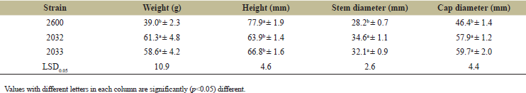 Representative FBs from strains 2600, 2033, and 2032 are shown in Figure 2a, b, and c, respectively. The morphological parameters of FB weight, height, stipe, and cap diameter that were measured indicated significant differences in test strains’ FBs (Table 3).