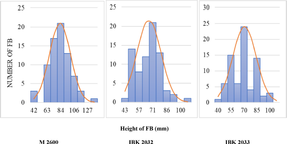 The average height of FBs in strain 2600 was 11 and 14 mm higher than results from strains 2032 and 2033, respectively (Fig. 4). The maximum FB height was 127 mm in strain 2600, the minimum was 40 mm in strain 2033, and the FBs from strains 2032 and 2033 did not exceed 100 mm. The samples’ distribution based on FBs’ height was more uniform and indicated that the asymmetry coefficient did not exceed 0.3 in strains 2032 and 2600; it was below 0.2 in strain 2033.