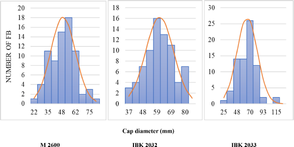 ![]() | Figure 5: Variations and distribution of FB cap diameter (mm) among P. eryngii strains. [Click here to view] |